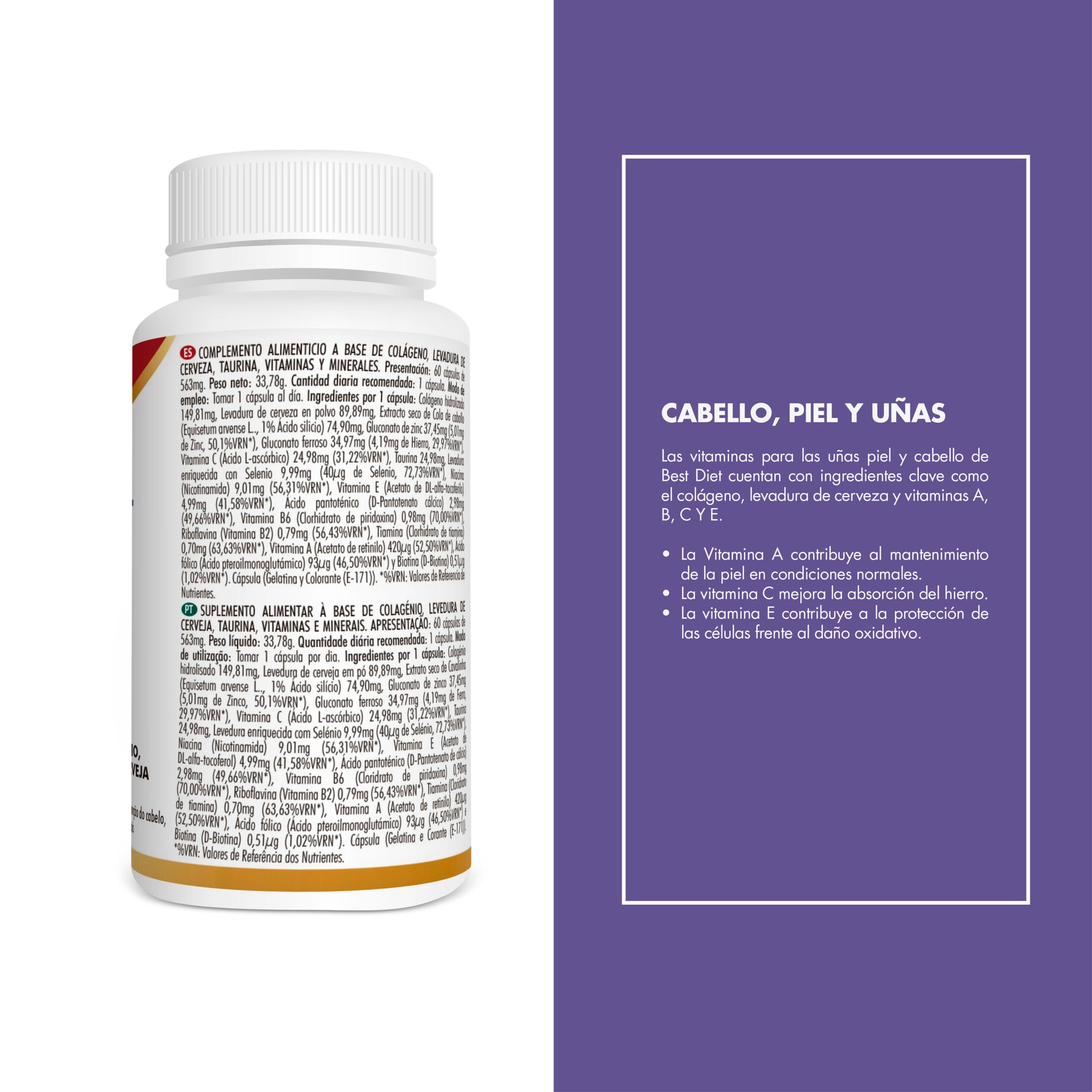 Colágeno hidrolizado 150mg, Levadura de cerveza en polvo 90mg, Extracto seco de Cola de caballo (Equisetum arvense L.., 1% Ácido silicio) 75mg, Celulosa microcristalina (agente de carga), Gluconato de zinc 37,12mg (5 mg de Zinc, 50%VRN*), Gluconato ferroso 34,57mg (4,2mg de Hierro, 30%VRN*), Vitamina C (Acido L-ascórbico) 25mg (31,25%VRN*), Taurina 25 mg, Levadura enriquecida con Selenio 10mg (22μg de Selenio, 40%VRN*), Vitamina E (Acetato de DL-alfa-tocoferilo) 50% 10mg (5 mg vitamina E 42%VRN*), Niacina (Nicotinamida) 9,12mg (57%VRN*), Ácido pantoténico (D-Pantotenato cálcico) 3mg (50%VRN*), Vitamina B6 (Clorhidrato de piridoxina) 0,98mg (70%VRN*), Riboflavina (Vitamina B2) 0,80mg (57%VRN*), Tiamina (Clorhidrato de tiamina) 0,70mg (64%VRN*), Vitamina A (Acetato de retinilo) 424μg (53%VRN*), Ácido fólico (Ácido pteroilmonoglutámico) 94μg (47%VRN*) y Biotina (D-Biotina) 0,5μg (1%VRN*). Cápsula (Gelatina). *%VRN: Valores de Referencia de Nutrientes.