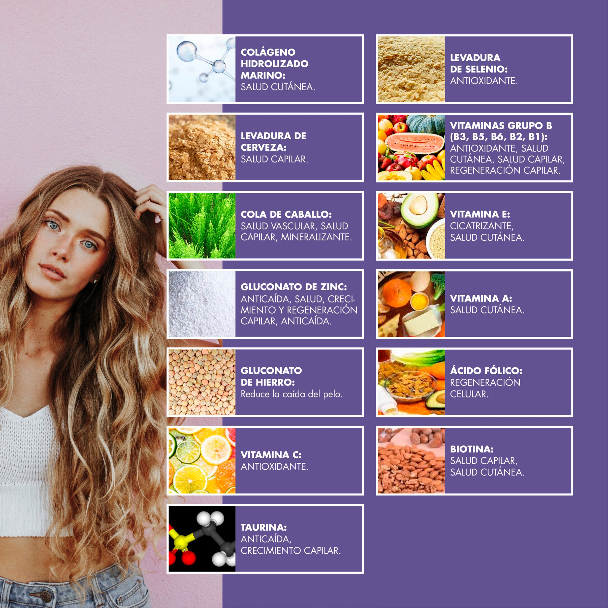 Nuestro complemento está especialmente dirigido a quienes quieren mejorar su aspecto por medio del mantenimiento de un cabello, piel y uñas saludables. Hemos desarrollado un producto especialmente dirigido a convertirse en el complemento alimenticio idóneo para conseguir un cabello, piel y uñas sanas y en buen estado.